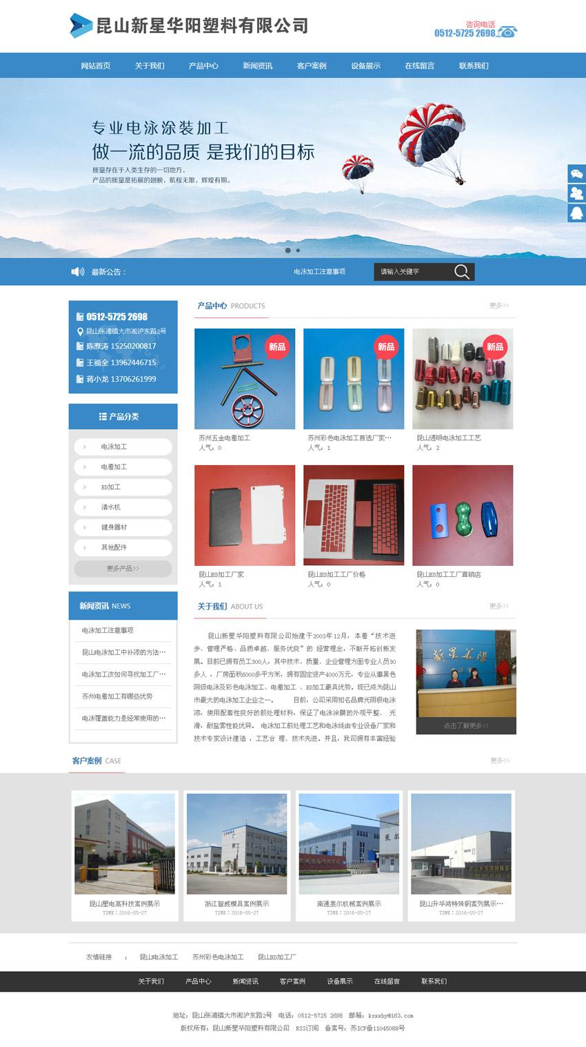 昆山新星華陽塑料有限公司始建于2003年12月,本著“技術進步、管理嚴格、品質卓越、服務優良”的 經營理念,不斷開拓創新發展。目前已擁有員工300人,其中技術、質量、企業管理方面專業人員30多人 ,廠房面積6000多平方米,擁有固定資產4000萬元,專業從事黑色陰級電泳及彩色電泳加工、電著加工 、ED加工最具優勢。現已成為昆山市最大的電泳加工企業之一。