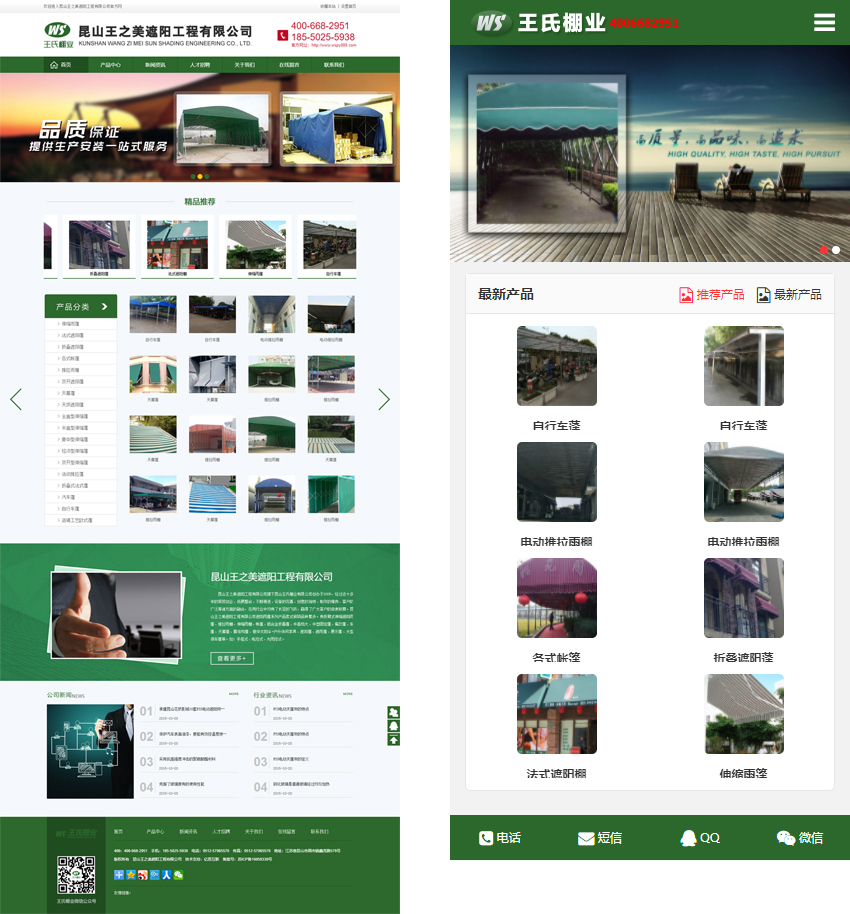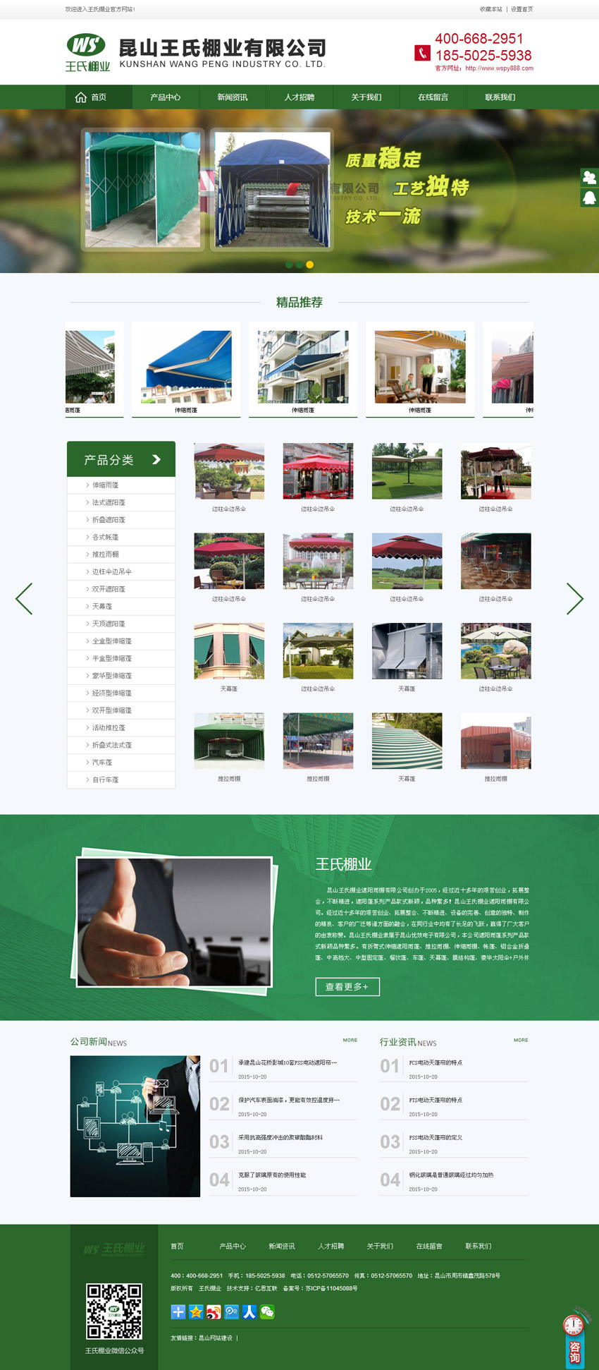 昆山王氏棚業遮陽雨棚有限公司創辦于2005,經過近十多年的艱苦創業、拓展整合、不斷精進、設備的完善、創意的獨特、制作的精良、客戶的廣泛等諸方面的融合,在同行業中均有了長足的飛躍,贏得了廣大客戶的由衷稱贊。昆山王氏棚業遮陽雨蓬系列產品款式新穎品種繁多。有折臂式伸縮遮陽雨蓬、推拉雨棚、伸縮雨棚、帳篷、鋁合金折疊蓬、中高檔大、中型固定蓬、餐飲蓬、車蓬、天幕蓬、膜結構蓬、豪華太陽傘+戶外休閑家具、遮陽蓬、遮雨蓬、展示蓬、大型停車蓬等。如:手搖式、電控式、光雨控式。